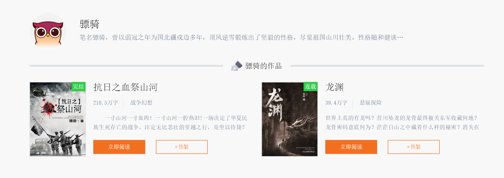 骠骑,网文之王全国百强大神,作协会员,中国作协职业道德委员会委员,军事题材作家、编剧,擅长革命历史、军旅特战题材创作。出版、网络连载三十多部作品,多部作品出售影视版权,近期作品《龙渊》。曾获第二届“中华文学基金会茅盾文学新人奖网络文学新人奖”。目前签约阿里文学,正在连载长篇军事小说《龙渊》。对于军事、历史的热爱,激发了骠骑的创作灵感,基层部队的经历,赋予了他强烈的军人意识和爱国热情,在他笔下,我们看到了英雄气概和民族气节,并结合网络小说流行的创作手法,在新军事题材开辟了独特的风格。