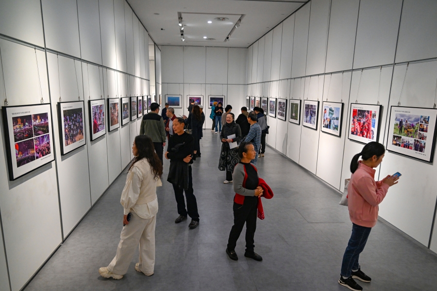 11月7日,摄影爱好者在观看摄影展。当天,由长沙市文学艺术界联合会主办,长沙市摄影家协会与隆平水稻博物馆联合承办的“新质·新景·新生活”——长沙市第五届摄影艺术展在隆平水稻博物馆开幕。此次展览主题紧扣时代脉搏,聚焦长沙落实“三高四新”战略,既是对长沙摄影创作成果的集中展示,也是摄影界深入生活、扎根人民、服务社会、礼赞时代的生动实践。展览共展出113件作品,涵盖纪录类、艺术类、手机类三大类别。(记者 郭立亮)