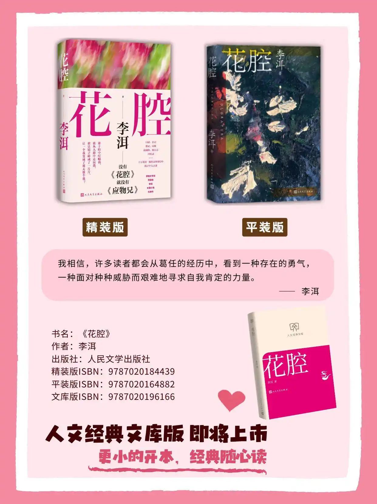 《花腔》人文经典文库版将于近期上市,更小的开本,将经典随行随心阅读。