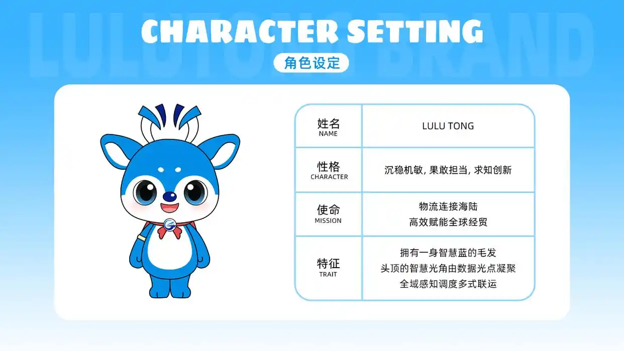 “浙港物流”文化体系深度融合物流集团生产经营特质,其IP形象“LULU TONG”以鹿为创意原型,谐音“路”,寓意物流通达四方、畅通无阻。形象设计融入了物流行业的元素符号,一身纯净蓝色毛发,象征覆盖全球的物流网络;头顶闪烁的数据光点,凝成“智慧鹿角”,体现调度海、铁、公多式联运的“智慧大脑”;身披的鲜艳红披风,则传递出物流人风雨兼程、永不退缩的进取精神。