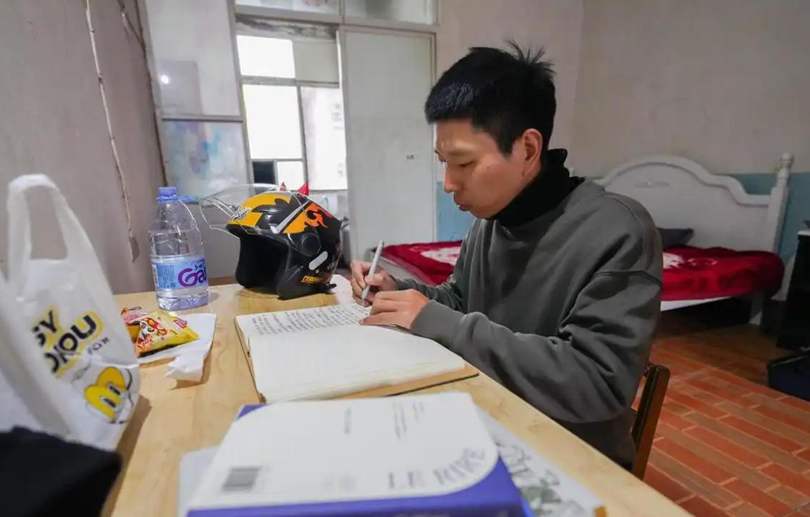 他租住在不足十平米的老旧筒子楼单间,墙面泛着霉斑,却被他收拾得一尘不染,褪色木桌上摆着台灯和写满字的笔记本。无论多忙,他每天必挤出两小时写作,“外卖箱是我的移动书桌,等餐间隙就掏手机写几句”,这是他一天中最放松的时刻。