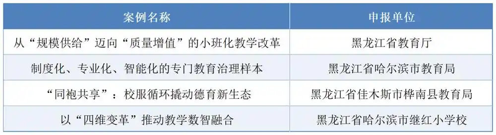 其中,由黑龙江省教育厅申报的从“规模供给”迈向“质量增值”的小班化教学改革案例立足黑龙江省人口结构性变化趋势,系统性实施小班化教学改革,推动基础教育从“规模供给”向“质量增值”。案例在边境地区启动试点积累初步经验后,将改革范围扩展到全省960所小规模学校,并将试点实践中行之有效的经验凝练固化为制度标准,形成行政推动与教研支撑“双轮驱动”模式。