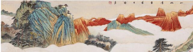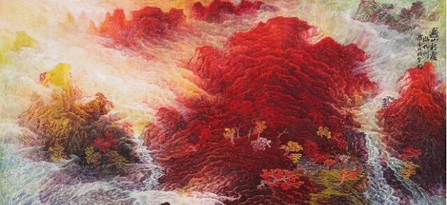 余静老师的山水画讲求意境,意即“思”,境即“象”,达到“思与境偕”便为妙,而且要“度物象而取其真”,余静老师借艺术形象表达宇宙奥秘和人生真谛。具有了深长隽永的意蕴。余静老师彩墨山水作品《遍山彩霞照九州》,以墨色为主,用朱砂红烘染,画面近景树茂瀑深,叶红雾浓,中景高耸的山崖上民居呈现温馨幽美氛围,远景瀑布闪亮,充满气势。画中水墨勾染细腻,景物杂而有序,笔墨有情意,引起读者的共鸣,展示出作者高深的意境和水墨绘画功力,收藏佳选!