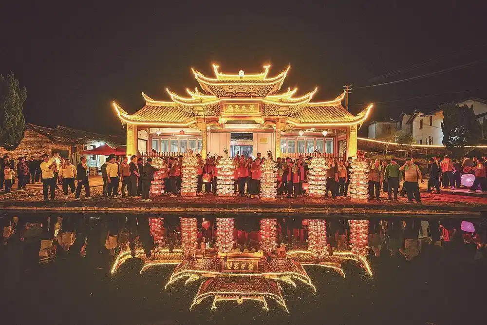 如果说拔龙展现的是力量与豪情,那么芷溪花灯则呈现出精巧与诗意。正月初四,芷溪古村花灯民俗文化节启幕,93盏花灯创下近年来之最。竹篾为骨、薄纸为面,每盏花灯内藏99盏明火,点亮后通透澄澈,被誉为“纸包火”的奇迹。花灯巡游队伍在阡陌间缓缓前行,古村在光影中如梦如幻,映照出客家人对团圆与祥和的期盼。