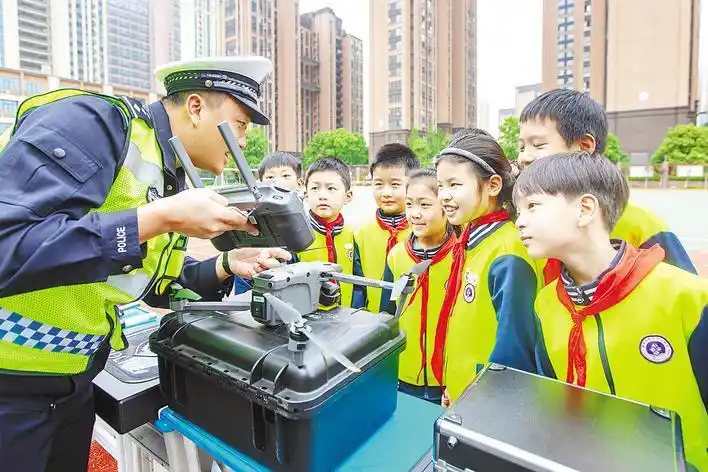 4月14日,民警在给学生们展示警用无人机。在第十一个全民国家安全教育日来临之际,襄阳警方走进襄阳市四十八中,开展“少年有志 强国有我 国家安全 人人有责”主题宣传活动。民警通俗易懂地宣讲国家安全知识,依托趣味知识转盘开展互动答疑,展示各类警用装备,让学生们沉浸式学习安全知识。(视界网 李旭晖 摄)