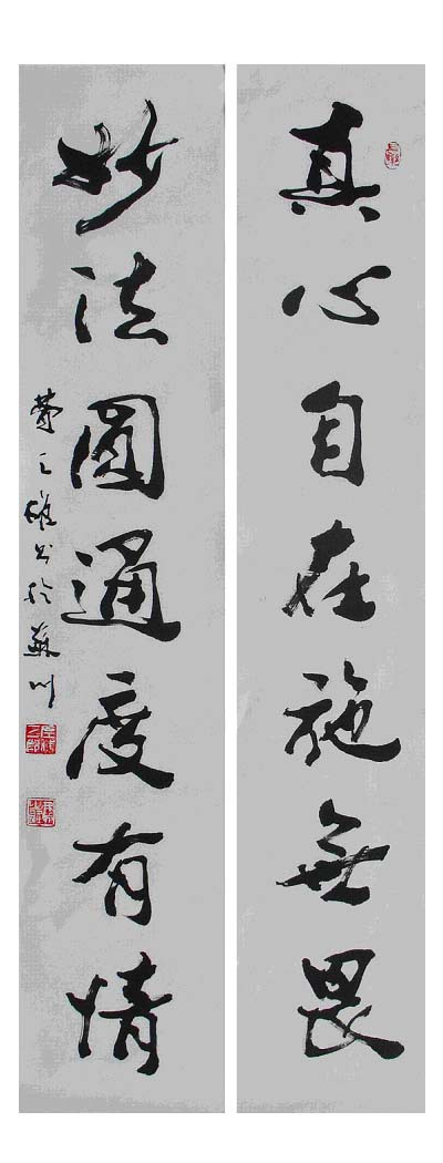 费之雄书法的第二个特色,是强调书法的认知功能。费先生是个杂家,雅博之极。他的古典文学功底如骈体文、诗词,尤其是对联,十分深厚。我多次听费之雄说过:“时代在前进,人们对作品的要求也与日俱增。书法家一味写现成诗文,终感有缺憾。我选择了‘对联’——这个被誉为世界上最优美的骈体文句,作为自己书写作品的载体,藉以对现实直抒己见,适应时代要求。”因而他的联语,绝大多数自拟自撰,自出心裁。