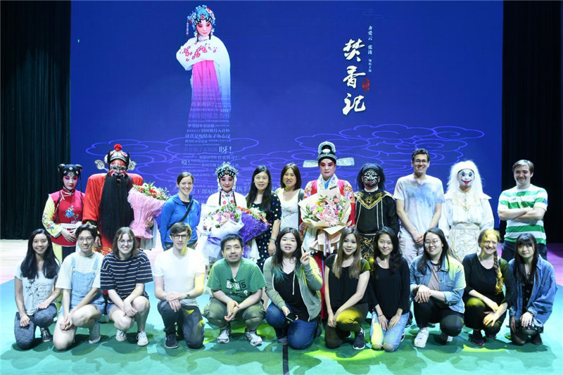 演出结束后,由艺术教育中心承办的教育部加拿大维多利亚大学中国文化研习项目的国外学生与齐爱云积极互动,表达了对于中国传统戏曲的喜爱和赞叹。
