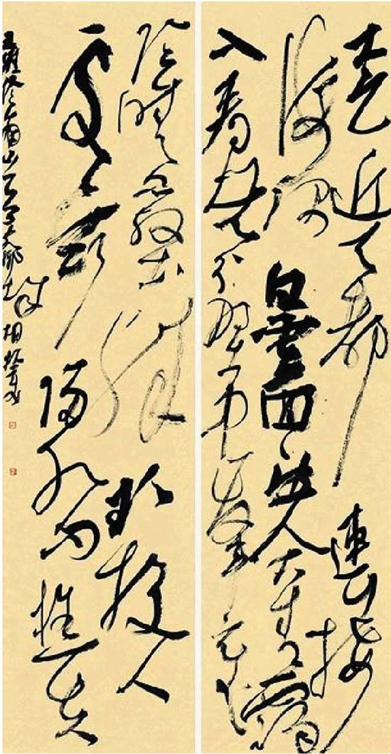 其三是整体意识。草书的笔划不论内在还是外沿,都有它特殊的特征。在草书中如果依然强调入笔、行笔、收笔,别说大草的创作,小草也是很难。草书强调笔划与笔划之间,解体与解体间、行与行之间的整体关系,用笔的轻重快慢,点划的粗细长短,墨色的浓淡枯湿,这一对对的矛盾组合在一起,必然会产生一种关系,这种关系就是书法家所要追求的。这种关系在草书中是在流动中产生的,它可能在一个字、一行字中只有入和收,甚至在字与字之间,组与组之间看不到他的入笔。草书的笔法是要有一个整体观念来看。最大的区别是对笔法的运用,而不是笔法的表现。