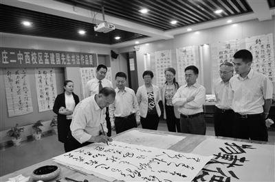 这次学校为他举行书法展,孟建国十分感动。他说,这也是对他的一次肯定、鼓励,也让他继续行墨不辍。