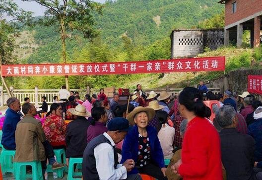 近日,江口镇大面村文化活动广场上一片欢声笑语,干部群众聚集在一起其乐融融。这是县教委、农商行等帮扶单位与江口镇在这里举行同奔小康荣誉证发放仪式暨“干群一家亲”群众文化活动的一个镜头。
