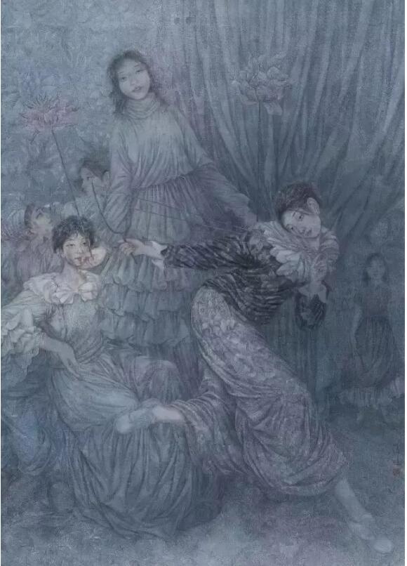 漆画的多种技法其实与当代日本画很接近,近来较为流行的岩彩画,其技法几乎在漆画中都有运用,如漆画中涂、窑变、打磨等技法吸收到工笔画中,丰富了工笔画的肌理表现效果。至于壁画几乎就是与国画互为发展的。相当多的壁画其实就是以工笔重彩的形式来表现的,壁画的充盈的构图、绚丽的色彩对崔进的影响很大。现代艺术中的平面构成手法对现代工笔画也很有启发。所以说,若从技术层面来说,各个艺术门类都接触一些,无疑是一种触类旁通式的训练,从中将不同的艺术语言不露痕迹地糅合在一起,在全部的文化传统中获得视觉的综合创造的想象力,从而形成和完善了崔进的绘画形式语言。
