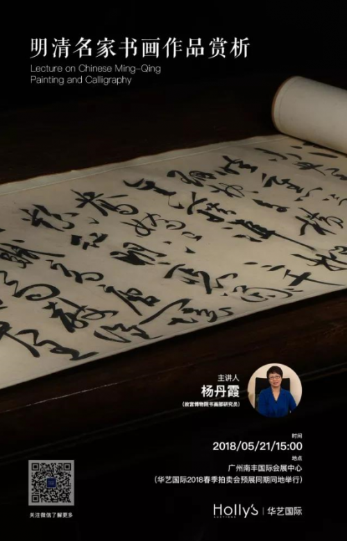 华艺国际2018春季拍卖会将于5月20-23日在广州南丰国际会展中心举行,届时将为藏家朋友们呈现多个门类逾1300件精彩拍品。5月21日预展现场,华艺国际有幸邀请到故宫博物院书画部研究员杨丹霞女士为我们带来一场“明清书画名家作品赏析”专题讲座,欢迎广大藏家与艺术爱好者届时参与。