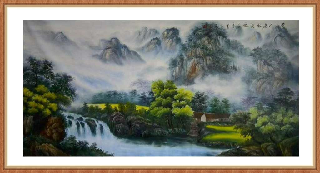在刀笔底质成骨的基础上,他施青绿金碧彩墨,极力追成墨韵气质,烟岚成浮动,流动成幻觉。泼墨潇洒,点墨龙睛,墨韵营造的意境深入心怀,让人久看不厌,如梦如幻的思绪油然而成,把江南风光的温婉秀丽渲染到沉鱼落雁的境界,又把北国气质突显出雄浑壮观的高度。刀笔留迹为画面之质,彩墨渲染成画面之脉,溪湍涧流长瀑如云,江波河涛滚涌成撼,质感鲜明,色彩明艳,山水尽善尽美,源于自然,胜于天功。