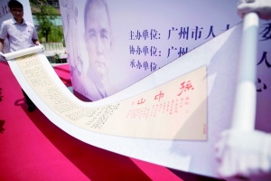昨日上午,《孙中山》《南越王赵佗》《冼夫人》大型文学台本书法长卷捐赠仪式在南粤先贤馆前广场隆重举行。该三幅书法作品由广东省作家协会副主席、中山市政协主席丘树宏进行再创作而成。广州市人大常委会主任陈建华、中山市政协主席丘树宏等领导出席活动。
