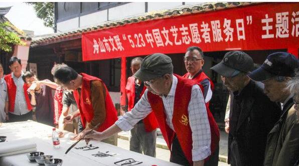 在中国文艺志愿者服务日到来之际,5月23日,舟山市十多位书法家志愿者走进定海区留方社区挥毫泼墨,创作出20多幅精美作品,赠送给现场群众。