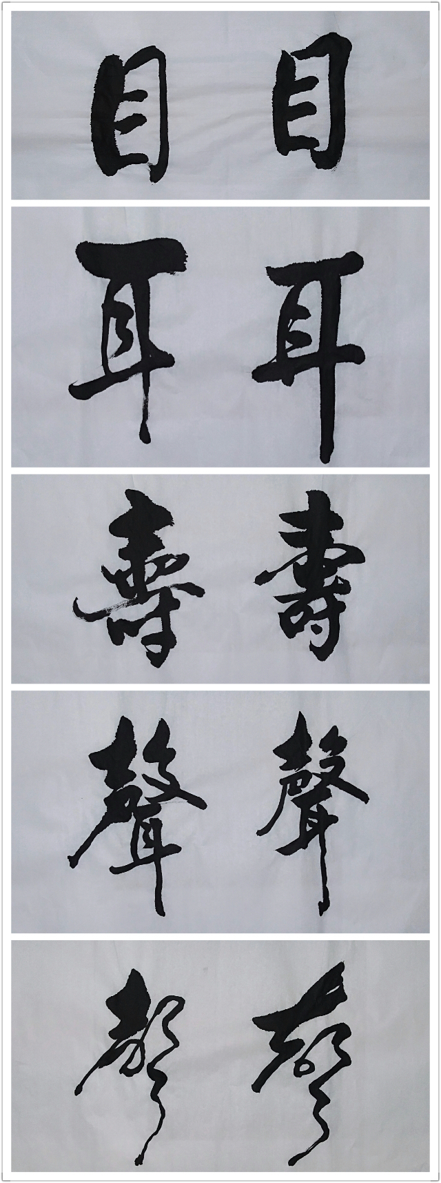 凡横画多而且短,竖画少但笔画长,上下排列的字喜体长忌瘦。如“目”、“耳”、“寿”、“声”等字。此类字纵向取势,上下伸展,左右靠拢,上下对正,重心平稳。注意横画不可拉得过宽,笔画须挺拔秀雅。体长者汉字,同体双笔书最能体现其艺术特色。横左送右导,送则柔导则健,左笔竖画左沿涩右沿光,反之右笔竖左沿光右沿涩,如同双扇门左右对称,开合自如,大合自然之道,构成阴阳和协之美。
