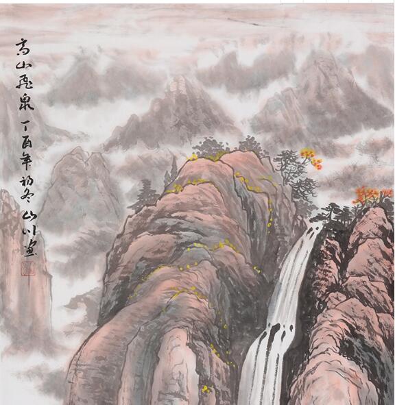 山川先生的画既有北方山水的雄浑苍茫,又有南方山水的秀美灵气;既有传统山水的笔墨技巧,又有现代绘画语言的变革。他的这幅国画山水作品,以略带仰视的视角入画,描绘了山高水长、气韵磅礴的山水景观。画面上山峦高耸,飞瀑流泉,其间花树点缀,为画面增添了无限生机。作品厚重而不失空灵,密实而不失疏淡,雄健而不失浑厚,颇具形神兼备的特点和风骨,使观者如临其境,如闻其声,收到了极强的艺术效果。