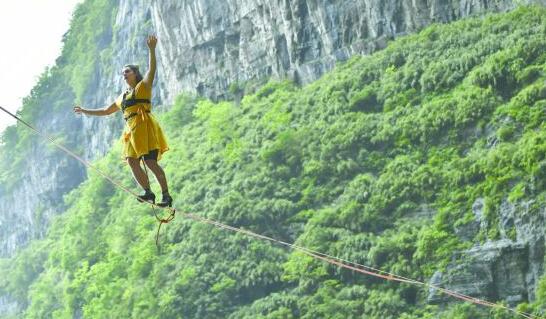 5月27日,张家界天门山景区举行女子穿高跟鞋走扁带比赛,来自美国、加拿大、法国的3名女子扁带运动高手穿着高跟鞋在25毫米宽、3毫米厚、60米长的高空扁带上行走。图为选手在比赛中。