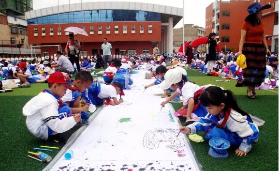 美术节分为百米长卷绘画、民族绘画兴趣班“百平米画卷大型合作绘画”、个人T恤创意画、个人画展、日常作业优秀作品展出等几大板块。活动中,孩子们通过一只只画笔,绘制一幅幅出色彩斑斓的画卷,将心底的梦想放飞在蓝天白云之下,让内心的愿望遨游于无限星空之中。