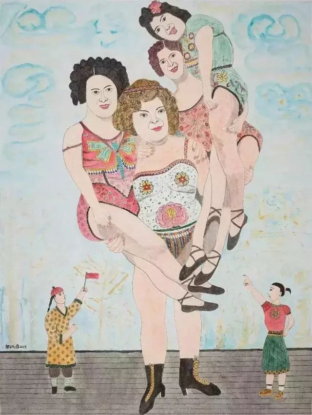 可能是因为没经过系统的绘画训练,她的人物造型并不准确,但这恰恰使她的画更为独特,整幅作品都洋溢着,一种亦庄亦谐的古怪的气息。