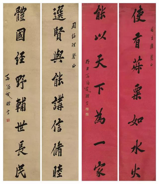 作为近代儒学第一人,马一浮先生在学术、书法、诗歌等多个方面都能独树一帜,而其存世的书法,也都是值得珍视的艺术品。他的书法有别于仅以书法名世者,取精用宏,不囿一家,不据一体,蔚为大家也。这两幅对联不仅书法精美,又极具用心,其承载的历史意义更是非凡而重大。