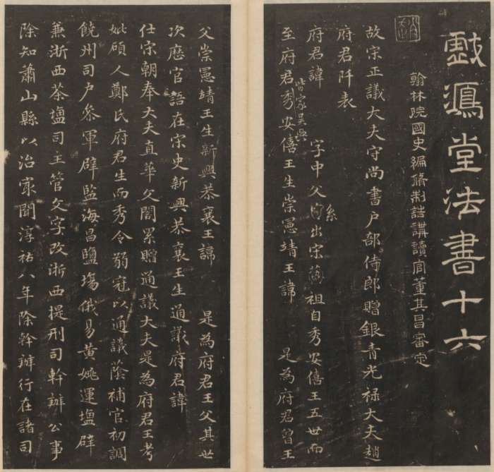 《戏鸿堂法书》第16册,《戏鸿堂法书》又名《戏鸿堂帖》,为明代著名刻帖,全帖十六卷,是由董其昌选辑晋、唐、宋、元名家书迹及旧刻本镌成。帖名隶书书写“戏鸿堂法书一”等。首开有“翰林院国史编脩制诰讲读官董其昌审定”隶书一行,尾款署“万历三十一年(1603年)岁在癸卯人日华亭董氏勒成”二行。董其昌是明代的书画大家,在他的一生中,除留下无数书画作品外,还致力于收藏前人的法书名作,《戏鸿堂法书》的辑刻就是他收藏活动的结晶。《戏鸿堂法书》的始刻时间无确切记载,据帖后年款,完成日期为万历三十一年。董其昌49岁时,由于董其昌极负盛名,此帖风行一时。