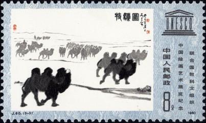 《联合国教科文组织中国绘画艺术展览纪念》纪念邮票,“牧驼图”,原画为中国现代著名画家吴作人所作。画面以一望无垠的沙漠为背景,一群双峰骆驼正迎着狂风,昂首阔步,奋勇向前。该图以墨为主,讲究变形换色,画面虚实有度,主次分明,左下角的骆驼以浓墨渲染,而其它骆驼则用淡墨次第减弱,视野开阔,画面空灵而不死板。