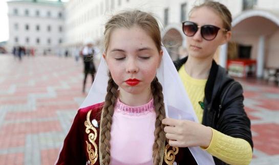 2018年6月15日,俄罗斯喀山,2018俄罗斯世界杯次日,俄罗斯美女参加文化活动,着传统服饰格外注目。