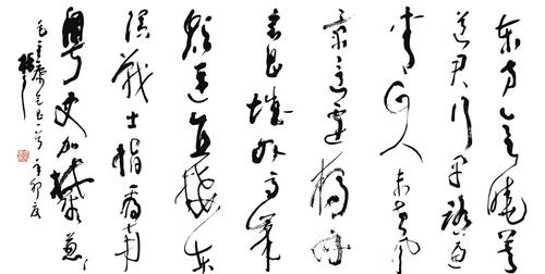 一个书法家的修养、阅历、造诣深了,心、眼、手就会有了神奇,此时,就不会再计较于外表的得失,而是超越了表象,不再“务于华而忘于实,溺于辞而弃其理”。乔建堂草书的点画已经不那么用意点缀,结构也不止于平正,用墨也不拘于匀称,而是干湿浓淡随心灵的交错跳动,信手而起,用笔轻松,用墨写意,少了外表的规范庄重,充满了灵性的自在自如和豪放不羁。当然在朴素、流畅而有韵律节奏的草书中,也充满了雄浑的气势。这也是乔建堂大隐于市、潜心学习研究书法艺术的不懈追求。