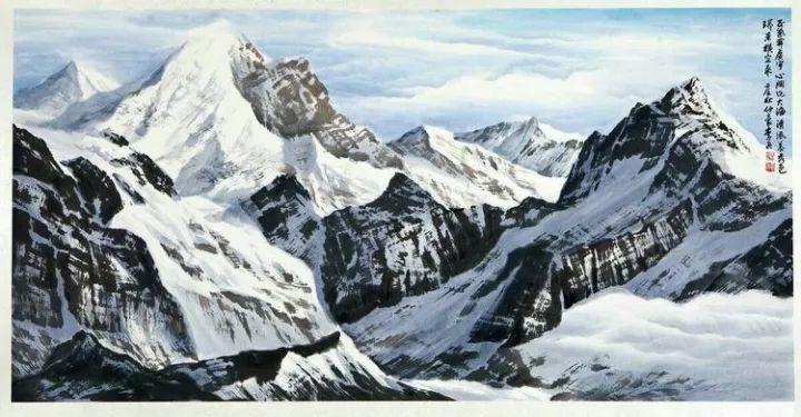 他创作的《天光雪岭共从容》,远方雪山矗立,峰石突兀,云雾缭绕,林木深邃;近景经幡飘动,雪水迤逦;整幅画面将雪山静态与云雾飘逸、溪流奔涌的动态巧妙结合,给人一种超尘脱俗的恬淡、清幽的娴静之美。整幅作品构成真与幻、拙与巧、恒与变、静与动对立统一的笔墨世界,从而形成了水墨雪山画的瑰丽艺术。