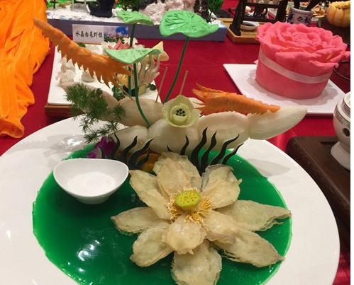 菊花秋葵制、青青啤酒泡虾、麻花鱼、宝塔鱼糕、象形松鼠鱼、羊肚菌狮子头、甲鱼炖鲜鲍、龙穿凤翅、酥炸荷花、精酱脱骨鸭掌