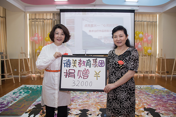 6月26日,由江苏省儿童少年福利基金会和凤凰网江苏联合主办,德美教育集团承办,江苏省中国画学会作为学术支持单位的公益活动“点亮星火——心灵的交换”美术治疗作品慈善义卖在德美幼儿园浦口国际幼儿园举办。义卖汇聚了爱心艺术家、德美幼儿园孩子和自闭症患儿的绘画作品共32幅,筹集善款3.2万元,由活动发起人、德美集团董事长陈维亚代表各方将善款捐献给了江苏省儿童少年福利基金会。