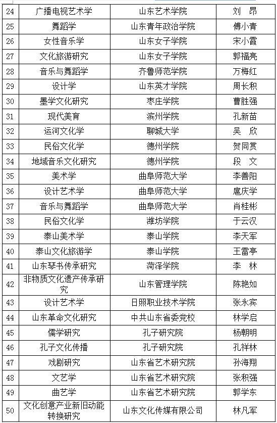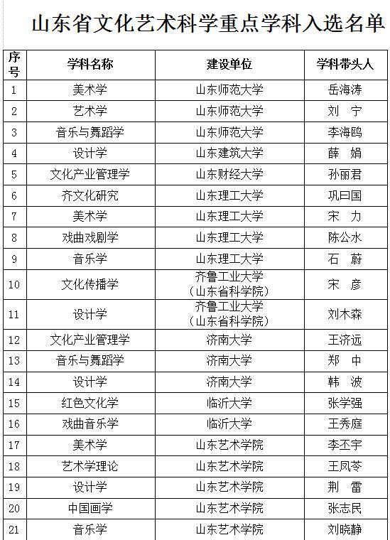 6月27日,记者从省文化厅文化科技与法规处获悉,根据《“十三五”时期山东省文化科技发展规划》《山东省文化科技重点实验室管理办法》《“十三五”时期山东省文化艺术科学重点学科建设管理办法》有关规定,山东省文化科技重点实验室、文化艺术科学重点学科入选项目公示期已满,且无异议。现将入选项目名单予以公布。