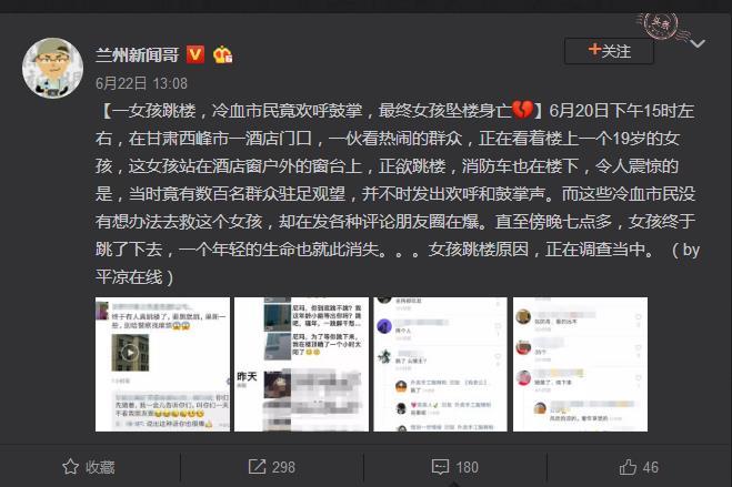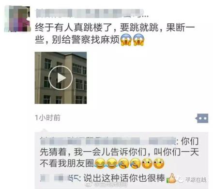 就在家人、警察、消防想方设法进行救援的人命关天的关键时刻,楼下围观的人群,竟然不时发出欢呼声、鼓掌声。倘若不能确定这种与现场紧张救援极不协调的欢呼鼓掌究竟要表达什么意思,那么,就看一眼他们发布在朋友圈的视频或文字及评论吧,那些东西,见证了他们对这一突发事件的态度,见证了他们对一条年轻生命的成见,甚至见证了他们自己的灵魂是高尚还是卑劣。