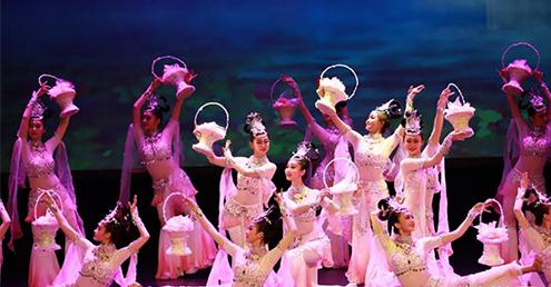 6月23日,在匈牙利首都布达佩斯,来自甘肃省歌舞剧院的演员表演大型舞剧《丝路花雨》中的经典片段《飞天散花》。