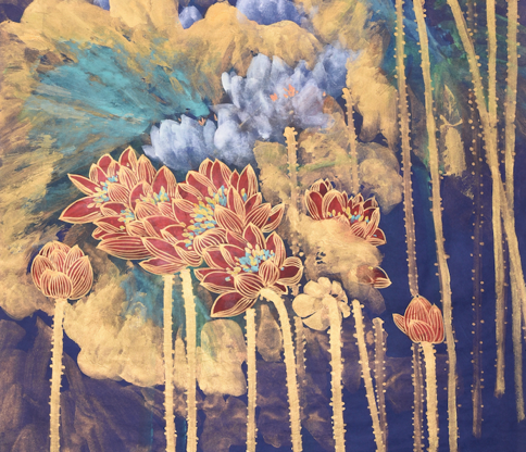 画家秦有田落笔大胆,突破原有的程式化绘画的限制,把泼墨和重彩结合起来,色墨交融,整个画面营造出璀璨绚烂的意境。画家秦有田笔下的荷花具有强烈的光色效果,在荷花边缘用画笔精细地勾勒上金黄色,营造出绚烂光感。同时用不同的颜色混合过渡,既有渐变层次,又有朦胧美感。背景往往用冷色调颜料进行泼彩处理,与金线红荷形成强烈的对比。