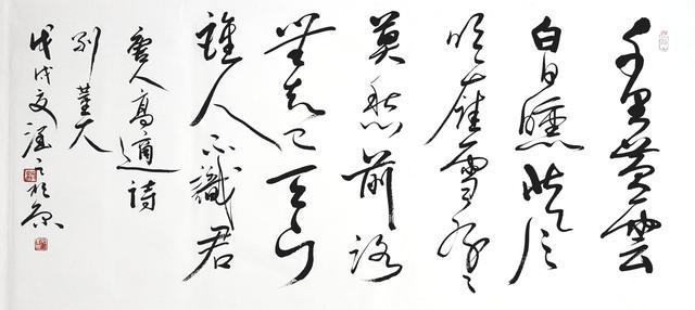 初见臧老师是在一个冬日暖阳的下午,我们走进位于北京先农坛一处幽静的古院落——臧老师的书法工作室,彼时他刚给一位索书者挥毫完毕。这是一首行草小令——马致远的《天净沙秋思》,我被这幅作品清雅、隽永、干净的画面所吸引。臧老师作品的书写内容多以唐诗宋词元曲为主线,而在唐诗宋词中又多以对精神自由运动的赞美,对自然理想化诗词代表为创作主题,细细读,慢慢品,使观者的脑海中形成一幅山水画面:一个归隐山林的人正在山脚下欣赏自然之美景,参悟超越天人的妙道。