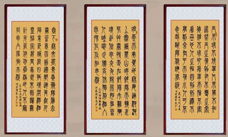 周秀良老师认为:篆书的结构之美首先体现在中和之美和对比之美上,其次体现在对称美和变化美上,中国传统篆书讲究对称美,从篆书出现之日起,这种美感便受到推崇和追捧,被奉为经典。