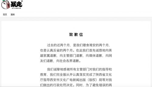 7月16日消息,时隔近两个月后,暴走漫画发布致歉信,称过去的近两个月,是我们寝食难安的两个月,也是认真反省的两个月。在此我们首先诚恳地向英雄家属道歉,向主管部门道歉,向媒体道歉,向网友们道歉,向社会各界道歉。
