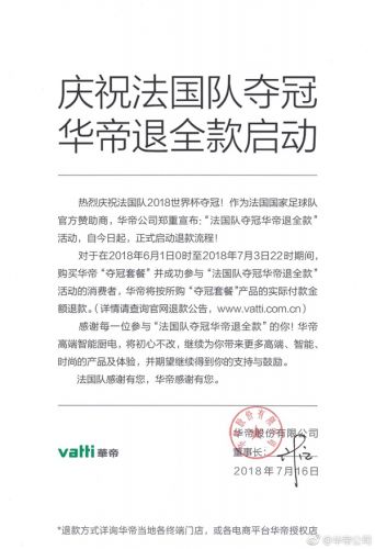北京时间7月16日凌晨,法国队4:2击败克罗地亚队,捧起世界杯!以“法国队夺冠退全款”作为营销大手笔的华帝,也启动退全款了,并在天猫等平台发出退款流程公示。