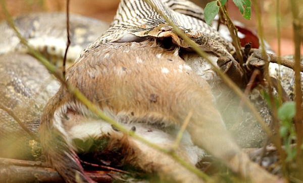 印度摄影师捕捉到岩蟒反刍斑点鹿 画面罕见