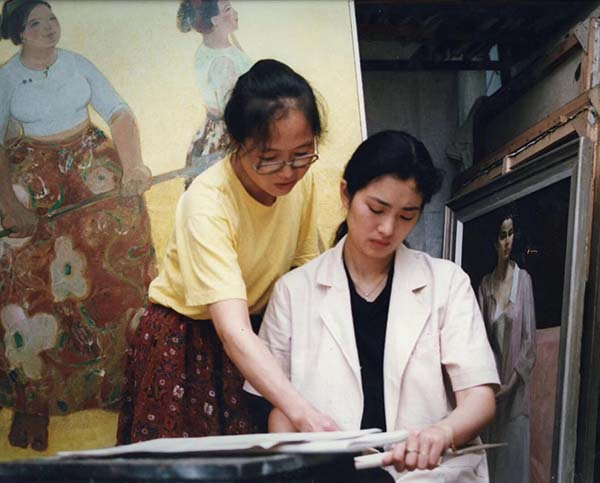 1992,任丽君(左)和巩俐在上海油雕院画室