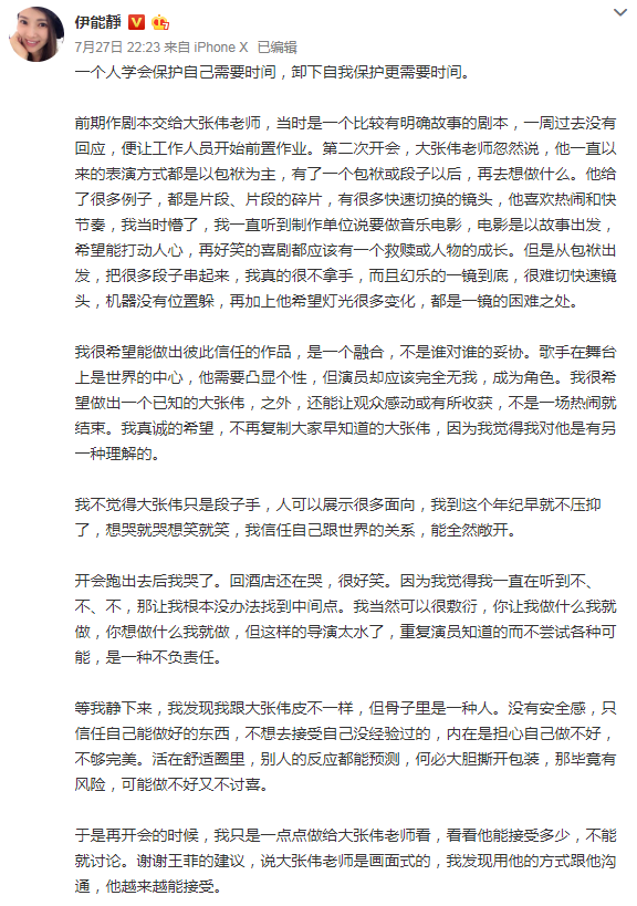 7月27日晚,伊能静更新微博澄清了录制时和大张伟合作的始末。她在微博中写到,自己不是很拿手大张伟热衷的把包袱串起来的拍摄方法,两人在前期的讨论中确实有很多障碍,但是自己也从来没有放弃过沟通。最后伊能静坦言,自己很尊重大张伟的不深刻,但是自己的文艺也不可笑。重点不是听谁的,而是真正容纳彼此的优点,接纳不同的部分,这才是创作最可贵的过程。