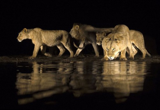 拍摄狮子喝水时由于受当时特殊情况和条件的限制,海格斯没有办法使用闪光灯以及其他任何专业的照明设备,他就借助LED射灯来照亮狮子的皮毛和水面。他用摄像头捕捉到了夜色中狮子金色皮毛和黄绿色眼睛的鲜明对比,从而充分展示出狮子尊荣威严的仪态。