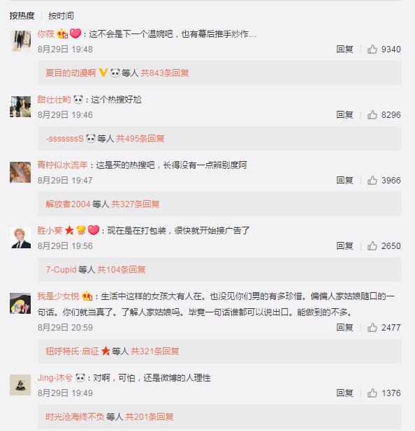 当然,不少网友和行业人士也纷纷表示,小甜甜的爆红存在幕后推手炒作。在新浪微博某情感博主发布关于小甜甜的一条微博评论里,我们可以看见许多类似评论。