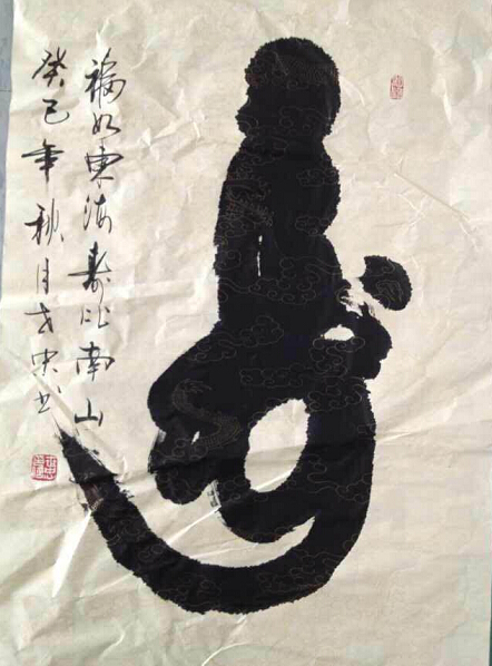 刘世忠先生最具有代表性的作品是他的“金猴献寿”系列。一笔寿五种寓意,“金猴献寿、长命百岁、马上封侯、蟠桃献寿和健康长寿”。作品书画结合,寓书于画,将“寿”字和“猴”的形象结合。刘世忠作画极有特色,“金猴献寿”作品一笔呵成,一挥而就,若非亲眼所见,很难相信他竟然如此作书。“寿”字在中国文化中寓意长寿,从古至今都是大吉大利长寿文化的代表,作品“金猴献寿”将“寿”字文化和猴文化融为一体,使得整个作品相得益彰,字形字意得到更好表现,充分展现了书法家的创作。因为猴与人类关系密切,人们向来对其有好感,中华传统文化当中尤其对猴特别偏爱一些。猴文化在我国有着悠久的历史渊源,如吴承恩在《西游记》中,朔造的美猴王孙悟空的艺术形象,不仅被中国老百姓所熟知,也为世界人民所喜爱。“猴”与“桃”更是常常结合在一起,喜食桃子乃是猴子的天性。在吉祥物中,桃是增寿的瑞果,有长寿的寓意;蟠桃献寿,猴与桃的结合,表示吉祥如意;马上封侯也是传统的寓意纹样,猴子骑在马上,寓意功名指日可待;“猴”与“侯”同音双关, 因此猴的形象多表示“封侯”之意。中国人认为猴是吉祥物,给“猴”增加了一种吉祥、富贵的象征意义,开创中国“寿”文化的新篇章。