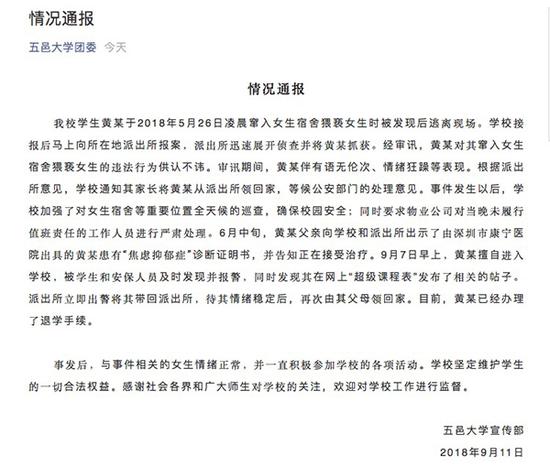 9月11日,@五邑大学团委 对外通报称,该校学生黄某于今年5月26日凌晨窜入女生宿舍猥亵女生时被发现,后逃离现场。学校接报后马上向所在派出所报案,派出所迅速展开侦查,并将黄某抓获。经审讯,黄某对其窜入女生宿舍猥亵女生的违法行为供认不讳。审讯期间,黄某伴有语无伦次、情绪狂躁等表现。根据派出所意见,学校通知其家长将黄某从派出所领回家,等候公安部门的处理意见。