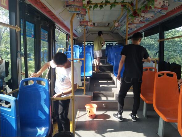 不怕脏,不怕累,用水桶接上水,洗抹布,大家有的拿抹布擦洗站牌上面的灰尘认真地擦车座、车窗、拉手、扶手,在公交车上,有的拿笤帚清扫地面上的碎物,志愿者们干得不亦乐乎,整个公益服务活动开展的井然有序。进行卫生死角清洁,重点是清除地板泡泡糖、座椅间隙尘土等,同时用过氧乙酸对车厢内的座椅、扶手、地面等进行全面消毒,防止部分流行病的传播。达到车辆卫生标准,3小时后,公交车内焕然一新。从而为广大乘客提供卫生、安全的乘车环境。