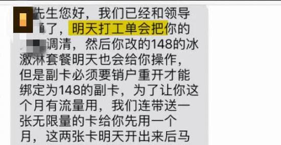 从马先生提供的聊天记录可以看到,联通方面表示会将欠费调清,并且附送一张无限量的卡让马先生使用,之后还会让当事人上门进行道歉。