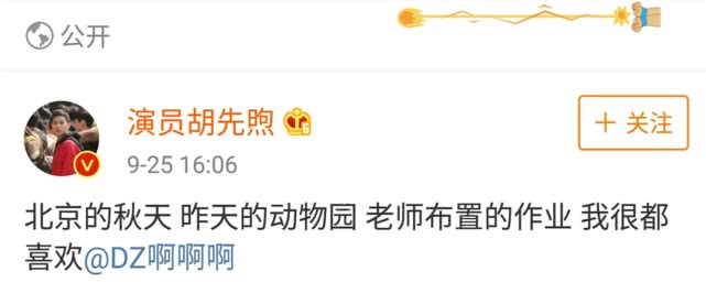 就在消息爆出没多久,当天下午胡先煦在微博发文公布恋情:“北京的秋天 昨天的动物园 老师布置的作业 我都很喜欢”,还甜甜地@了女友。胡先煦的经纪人也确认了胡先煦现在确实是在谈恋爱。